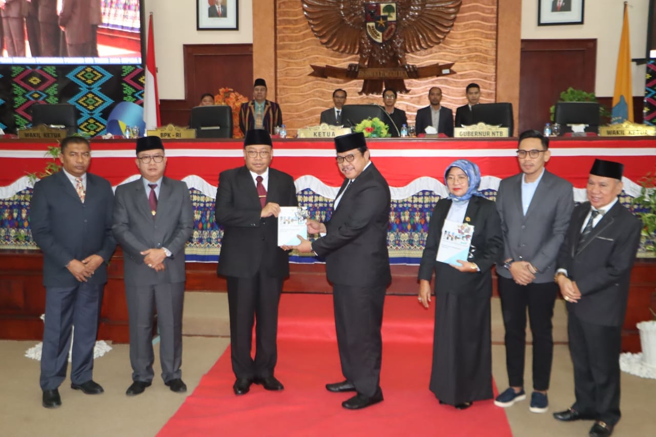 Rapat Paripurna DPRD Provinsi NTB, dipimpin oleh Ketua DPRD Provinsi NTB- Hj. Baiq Isvie Rupaeda, S.H., M.H. dalam rangka Penyerahan LHP BPK RI terhadap laporan Keuangan Pemerintah Provinsi NTB Tahun 2023.