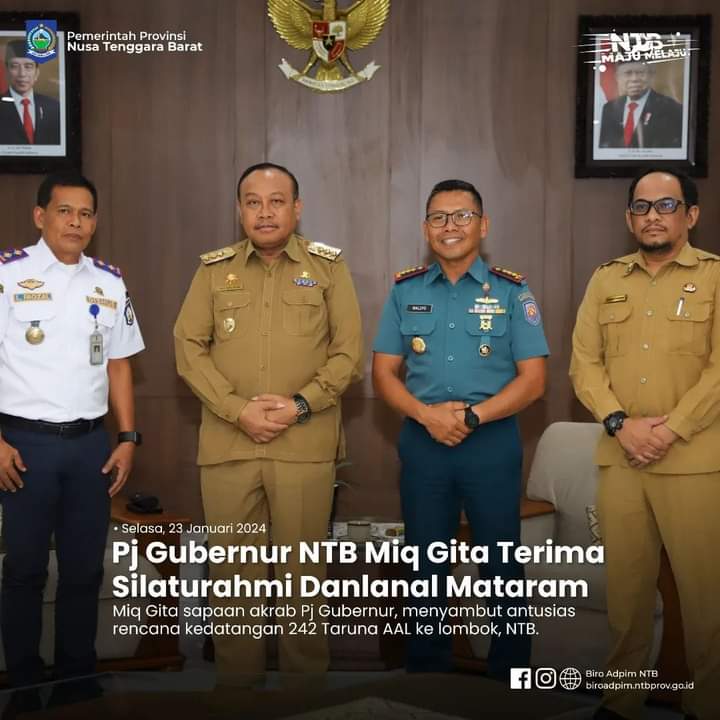 Penjabat Gubernur NTB, Drs. H. Lalu Gita Ariadi, M.Si di dampingi Kepala Biro Umum Setda Provinsi NTB, Hendra Saputra, S.STP., M.H dan Kepala Dinas Perhubungan Provinsi NTB Lalu M. Faozal menerima silaturahmi Komandan Pangkalan TNI Angkatan Laut (Danlanal) Mataram Kolonel Laut (P) Waluyo, S.H,.M.Tr., Hanla., M.M di Ruang Tamu Utama kantor Gubernur NTB, Selasa 23 Januari 2024.